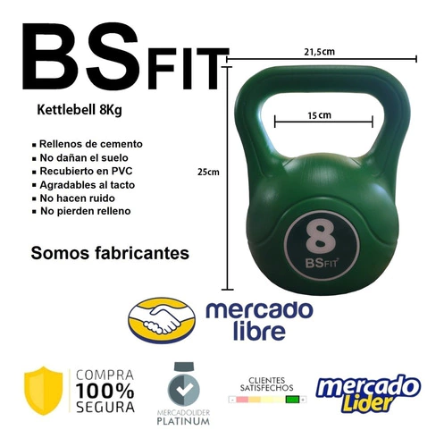 Incluye: 2 pesas rusas de 8 kg color verde con logo y número en resina importada.