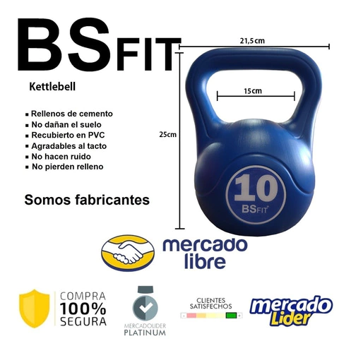 Set de pesas rusas BSfit compuesto por 3 unidades de 6 kg, 8 kg y 10 kg, ideales para entrenamientos funcionales, de fuerza o rutinas en casa. Diseñadas con exterior plástico resistente y relleno interno compacto, brindan un excelente equilibrio y agarre.
