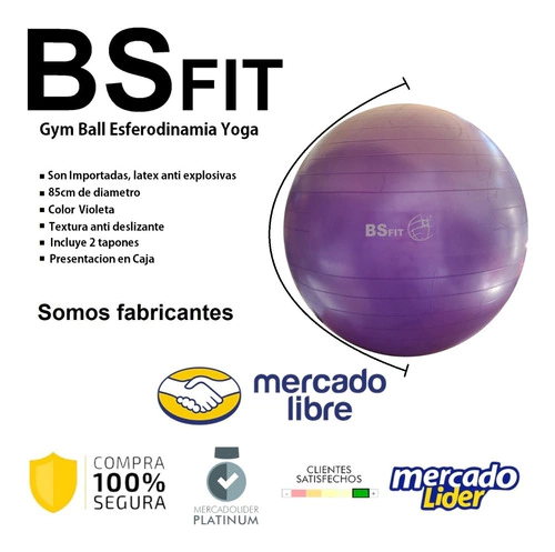 Pelota de esferodinamia BSFit de 85 cm de diámetro, fabricada en látex de alta resistencia con un espesor de 3 mm y peso de 1250 g. Su superficie incluye bandas antideslizantes para mayor seguridad durante el ejercicio, y sistema antiexplote, que impide que reviente al estar en contacto con objetos punzantes. Ideal para pilates, rehabilitación, fitness funcional o yoga.