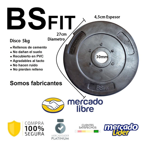 -Disco de 5 kg liso -Diámetro de agujero interno : 030mm -PVC super resistente -Relleno con concreto -Disponible en color Negro - Marca BSfit