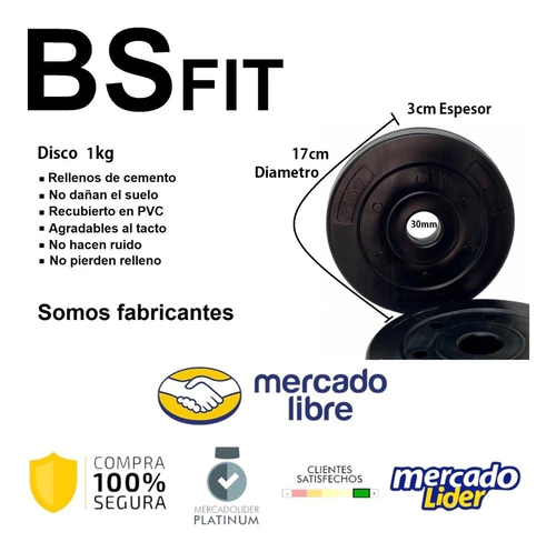 KIT DE PESAS (MANCUERNA + 24 KG EN DISCOS) ESPECIFICACIONES: - Peso Total: 24 Kg. - Discos de munición de acero y concreto, recubierto en plástico de alta resistencia. - No rayan el piso - No se despintan - ¿ QUE CONTIENE EL KIT ? - 2 Mancuernas Con Topes - 2 Discos de 5 kg Encastrables entre si. - 4 Discos de 2.5 KG Encastrables entre Si. - 4 Discos de 1 KG EN COLOR NEGRO Somos una empresa líder en accesorios y equipamiento deportivo.