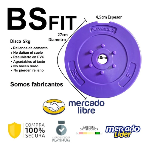Kit Local de pesas de plástico 17kg Negro o Violeta El kit Incluye es en Negro discos plásticos Encastrables entre Si. 1-Barra Hueca con topes Tijeras de 25 mm Soporta hasta 50 kilos 2-Discos de 5kg Negro Liso Encastrable 2-Discos de 2,5kg Negro Liso Encastrable 2-Discos de 1kg Negro Liso Encastrable LOS DISCOS ENCASTRAN ENTRE SI ( 1 KG - 2.5 LG - 5 KG ) Los discos son plásticos rellenos de cemento. A PARTIR DEL 17/02/22 A LAS 9:00 HS VIENE DE REGALO UN PAR DE TOBILLERAS DE 1 KILO, EN EL KIT NEGRO VA CON TOBILLERA AZUL Y EN EL VIOLETA TOBILLERA AZUL. Somos una empresa líder en accesorios y equipamiento deportivo. Tenemos un 99% de calificaciones positivas: podes comprar con total confianza! Somos Mercado Líder Platinum (la calificación más alta con la que mercado libre distingue a los mejores vendedores del sitio). ----------------------------------------------------------------------------------------------------- FORMAS DE PAGO Podes pagar a través de mercado pago con tarjeta de crédito al instante ó en efectivo, generando un cupón de pago y luego dirigiéndote al centro de pago de tu preferencia (Rapipago, Pago Fácil, entre otros). Emitimos Facturas “A” ó “B” dependiendo del cuit o DNI que tengas cargado en tu cuenta de Mercado Pago, es importante que antes de realizar la compra verifiques que estén bien los datos, ya que la factura se genera automáticamente con tus datos de registro. ----------------------------------------------------------------------------------------------------- FORMAS DE ENVIO - Mercado Envíos a todo el país. - Envíos Rápido a Domicilio en el día (Mercado Flex), - Se entregan de Lunes a Viernes de 15 a 20 hs y Los Sábados de 14 a 19 hs. - Vehiculo Propio - Moto Express / Mensajería privada (*) - Vía Cargo / Empresas de micro y encomienda (*). (*) Consulte el valor del envío de acuerdo a su localidad/zona, De seleccionar esta opción debe elegir “retiro en domicilio del vendedor”. -Cotizacion y Días de Entrega, para Zona Norte,Zona Sur y Zona Oeste,Gran Buenos Aires UBICACIÓN Podes retirar tu compra por nuestras oficinas y deposito en el Barrio de Villa Soldati, Ciudad Autónoma de Buenos Aires estamos a 2 cuadras de Av Cruz y Av Varela. ------------------------------------------------------------------------------------------------- HORARIOS - De Lunes a Viernes: de 8 hs a 17 hs - Sábados: de 10 hs a 13 hs. NO OLVIDES VISITAR NUESTRO E-SHOP CON UNA GRAN VARIEDAD DE PRODUCTOS: https://eshops.mercadolibre.com.ar/bsfit