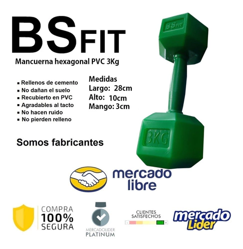 Par de Mancuernas PVC 3KG HEXAGONAL BSFIT Relleno: Granalla metálica y cemento Selladas herméticamente Agarre confortable Suave al tacto Color: VERDE Largo: 28 cm Alto: 10 cm Agarre: 3.5 cm Precio POR PAR SEMARUSACOM Somos una empresa líder en accesorios y equipamiento deportivo. Tenemos un 99% de calificaciones positivas: podes comprar con total confianza! Somos Mercado Líder Platinum (la calificación más alta con la que mercado libre distingue a los mejores vendedores del sitio). ----------------------------------------------------------------------------------------------------- FORMAS DE PAGO Podes pagar a través de mercado pago con tarjeta de crédito al instante ó en efectivo, generando un cupón de pago y luego dirigiéndote al centro de pago de tu preferencia (Rapipago, Pago Fácil, entre otros). Emitimos Facturas “A” ó “B” dependiendo del cuit o DNI que tengas cargado en tu cuenta de Mercado Pago, es importante que antes de realizar la compra verifiques que esten bien los datos, ya que la factura se genera automáticamente con tus datos de registro. ----------------------------------------------------------------------------------------------------- FORMAS DE ENVIO - Mercado Envíos a todo el país. - Vehiculo Propio - Moto Express / Mensajería privada (*) - Vía Cargo / Empresas de micro y encomienda (*). (*) Consulte el valor del envío de acuerdo a su localidad/zona, De seleccionar esta opción debe elegir “retiro en domicilio del vendedor”. -Cotizacion y Días de Entrega, para Zona Norte,Zona Sur y Zona Oeste,Gran Buenos Aires UBICACIÓN Podes retirar tu compra por nuestras oficinas y deposito en el Barrio de Villa Soldati, Ciudad Autónoma de Buenos Aires estamos a 2 cuadras de Av Cruz y Av Varela. ------------------------------------------------------------------------------------------------- HORARIOS - De Lunes a Viernes: de 8 hs a 17 hs - Sábados: de 10 hs a 13 hs. NO OLVIDES VISITAR NUESTRO E-SHOP CON UNA GRAN VARIEDAD DE PRODUCTOS: https://eshops.mercadolibre.com.ar/bsfit